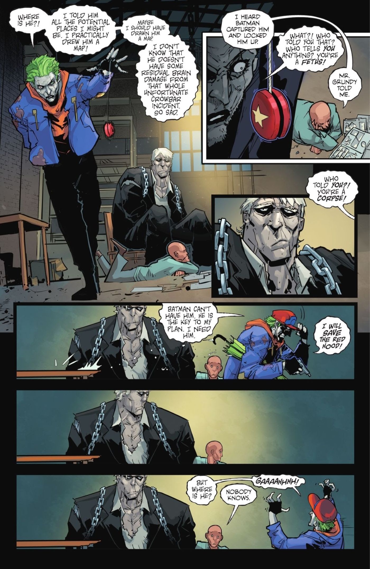 Joker no parece interesado en matar a Jason por segunda vez, tratándolo principalmente como un obstáculo a evitar, para disgusto de Jason. Sin embargo, esto parece haber cambiado, sea cual sea el plan que tenga Joker requiriendo a Red Hood, lo que significa que, en un giro extraño, Joker tendrá que salvar a Red Hood de villanos como Scarecrow. así como héroes como Batman. Uno de los momentos más oscuros de los cómics recientes fue cuando Batman cambió la química cerebral de Red Hood en contra de su voluntad, haciendo que Red Hood no pueda hacer nada que implique alta adrenalina, poniendo en peligro a Jason como nunca antes, ni siquiera durante su mandato como Robin, que terminó. en su muerte.