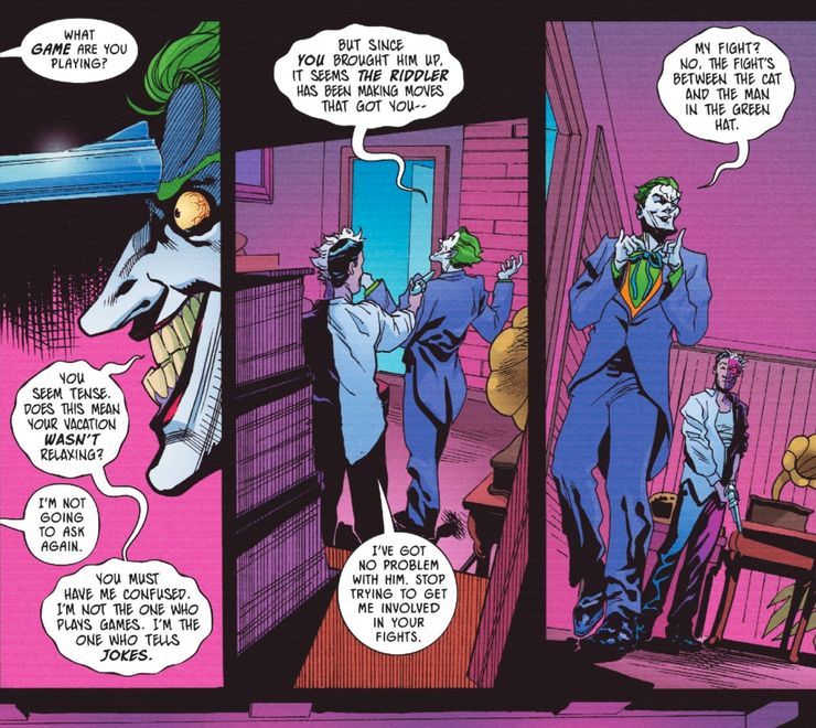 Aunque algunos pueden descartar casualmente esta diferencia entre una broma y un acertijo, como lo hace Catwoman cuando dice sin rodeos que no le importa en “La guerra de chistes y acertijos” de Tom King, la diferencia es fascinante. La obsesión de Riddler con los acertijos significa que Batman siempre será un participante activo, creando oportunidades para que Edward Nigma supere a su adversario. Batman también tiene la oportunidad de doblar las reglas del juego de maneras impredecibles, de modo que incluso un golpe maestro como Riddler para descubrir la identidad de Batman perdió su diversión. La afición de Joker por las bromas significa que solo quiere llegar al remate. La reacción de Batman puede aumentar la satisfacción del Príncipe Payaso del Crimen, pero contar el chiste suele ser suficiente satisfacción.