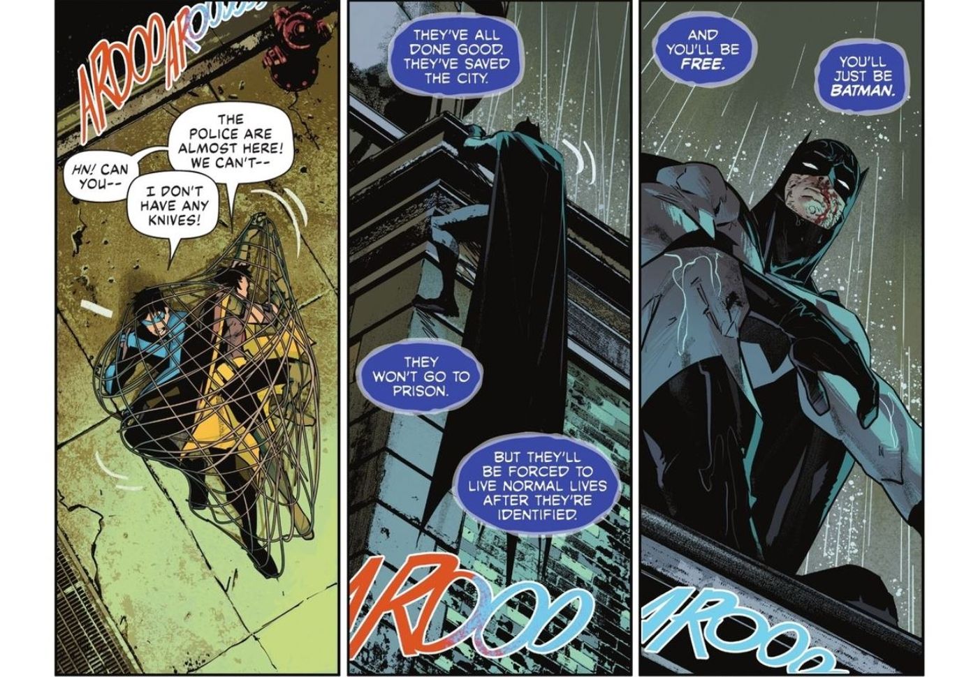“/> Nightwing accede a los sistemas remotos de Batman y descubre lo que Bruce le hizo a Red Hood. Nightwing lucha contra Batman con todo lo que tiene, incapaz de creer que Batman le haría algo así a su familia. Tim Drake evita que Dick lastime gravemente a Bruce, lo que le da a Batman el tiempo que necesita para contener a sus aliados. Batman deja a Dick, Tim e incluso a su hijo Damian para que las autoridades los descubran, creyendo que exponer sus identidades los obligará a vivir una vida normal y le permitirá operar sin trabas.