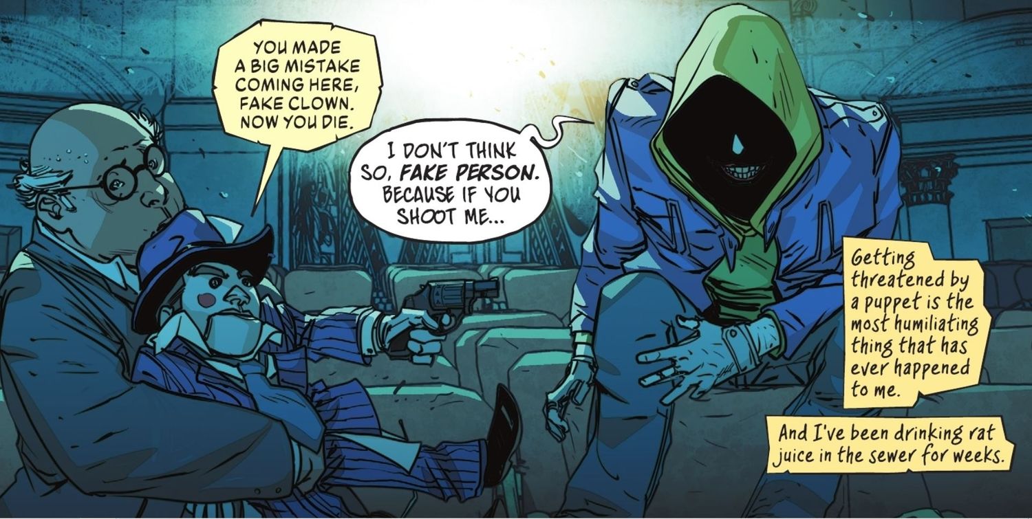 Joker tiene interés en asegurarse de que Gotham tenga villanos dignos. Se ve a sí mismo como el contraataque definitivo a Batman y quiere asegurarse de que el héroe sea desafiado adecuadamente. Es humillante para el Guasón ser amenazado por un hombre que sostiene una marioneta y un arma porque en una ciudad que tiene gente cocodrilo y monstruos llenos de veneno, alguien como el ventrílocuo no es más intimidante que un matón al azar con un arma. En todo caso, la marioneta de Ventriloquist suaviza su imagen. A los ojos del Joker, el ventrílocuo arrastra al resto de la camarilla de supervillanos de Batman y los hace parecer tontos. Los fanáticos pueden ver al villano llamar al peor pícaro de Batman en El Guasón: El hombre que dejó de reír #9a la venta ahora.