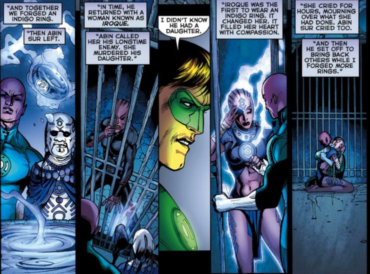 Si bien se supo poco sobre la tribu durante años, Hal Jordan descubrió los orígenes oscuros de la tribu Indigo Lantern en linterna verde #9 por Geoff Johns y Doug Mahnke. Resulta que el predecesor de Jordan, Abin Sur, ayudó a crear la Tribu como un medio alternativo para castigar a los peores criminales de la galaxia. Al forzar la luz de la compasión sobre aquellos que ingresan a la Tribu, sus miembros se ven instantáneamente abrumados por la empatía. Incluso los villanos más desesperanzados pueden convertirse en personas solidarias, como el líder de la tribu, Iroque, también conocido como Indigo-1. Incluso algunos de los mayores enemigos de Hal Jordan eran miembros de la Tribu. Black Hand y Sinestro fueron admitidos a la fuerza y Lantern fue testigo de primera mano de la compasión que mostraron. La luz púrpura de la compasión es bastante similar a la luz naranja de la codicia de Larfleeze, donde aquellos expuestos a ella se encuentran experimentando cambios radicales de personalidad. Pero la luz de la Tribu Indigo puede tener un efecto positivo, que se muestra cuando Indigo-1 se libera temporalmente de su influencia y se encuentra cambiada para mejor.