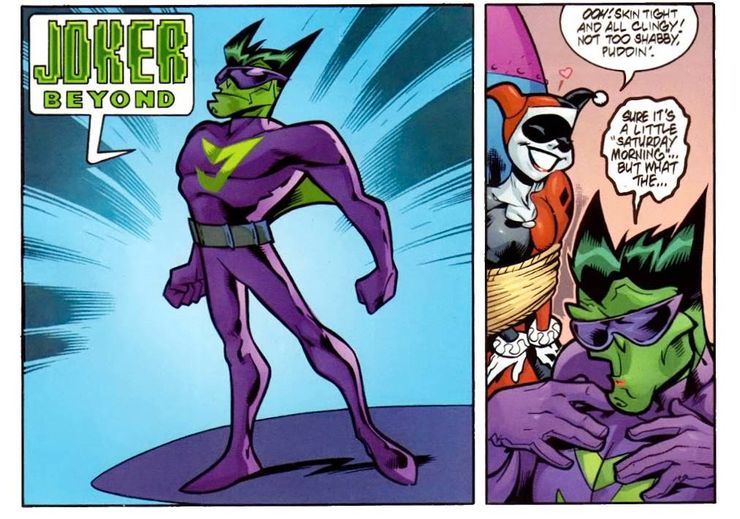 Mientras el Guasón se reinventa a sí mismo con un aspecto nuevo y espectacular, se transforma varias veces con personajes nuevos, como el Guasón II, el Guasón Clásico, el Guasón 2000 y el Guasón Más Allá. El aspecto final incorpora una versión con el tema de Joker del Batman del Futuro traje. Las medias moradas, las alas verdes de las axilas y el emblema angular J en el pecho recuerdan el icónico traje de Terry McGinnis. En respuesta, Harley Quinn expresa que le gusta el disfraz y dice: “¡Piel apretada y pegajosa! No está mal, Puddin’. a lo que el Guasón responde: “Claro que es un poco ‘sábado por la mañana’ pero qué…” La parodia es sorprendente en parte porque el sofisticado y peligroso Batman del Futuro El disfraz generalmente se considera uno de los looks más geniales que jamás haya tenido el Caballero Oscuro.
