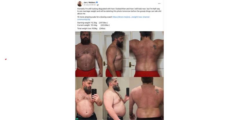 Lo subtituló: “Sinceramente, todavía estoy jodidamente disgustado con cómo me veía entonces y cómo me veo ahora.Jon parece querer lucir como lucía antes de casarse con Rachel. Dijo que estaba “a mitad de camino” de su peso anterior al matrimonio. Agregó que Su peso inicial era de 247,5 libras, su peso actual es de 223,5 libras.y su peso total es de 24 libras. El collage de fotos tiene tres fotos de Jon del “antes” y tres “después” fotos.