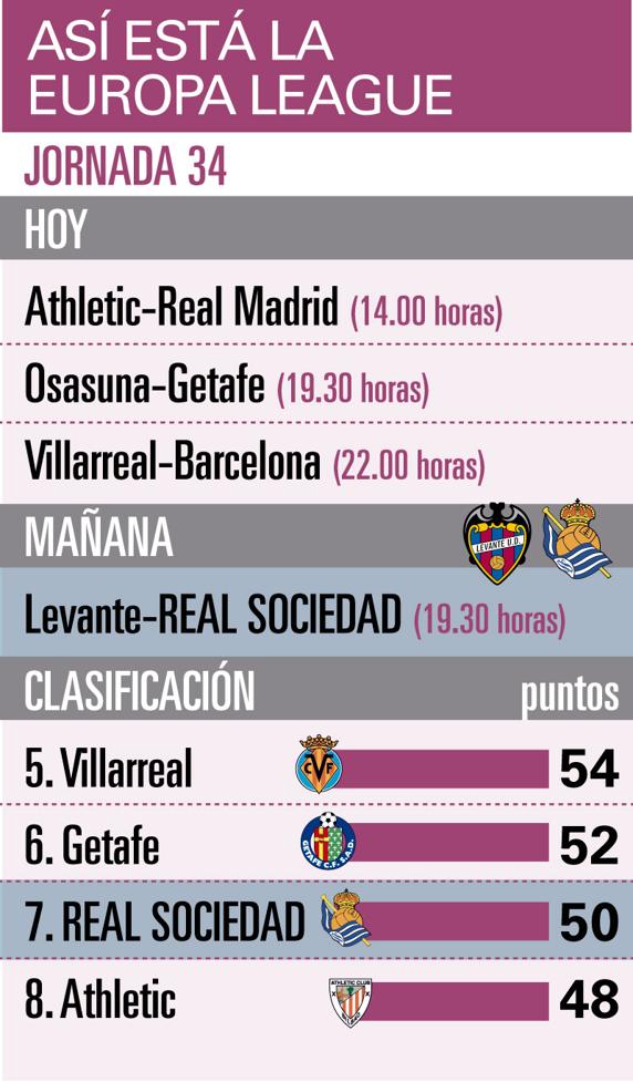 De quedar fuera de puestos europeos y cosechar su quinta derrota consecutiva, a poder dar un golpe encima de la mesa y entrar de lleno en la lucha por la Europa League en tan sólo cuatro días. Es lo que tiene el fútbol en tiempos de coronavirus. La Real tendrá hoy una previa diferente. Acostumbrados a descansar en el hotel de concentración, seguro que cada jugador desde su habitación individual enciende su tablet para seguir el devenir de una jornada que puede ser clave para viajar por Europa la próxima temporada. Los de Imanol jugarán mañana ante el Levante sabiendo que han hecho sus rivales directos. Athletic, Getafe y Villarreal dan el pistoletazo de salida a la pelea continental en la jornada 34.