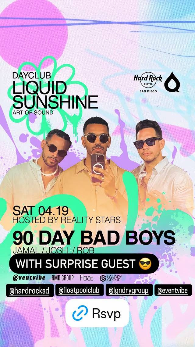 Josh Llevó a Instagram para anunciar que él, Rob Warne y Jamal Menzies (conocidos colectivamente como los Bad Boys de 90 días) han sido contratados para organizar un evento llamado Dayclub Liquid Sunshine: Art of Sound en el Hard Rock Hotel en San Diego, California. Mientras que el oficial Eventbrite Page para la fiesta dice que tendrá lugar durante todo el verano los sábados por la tarde, Josh, Rob y Jamal estarán allí el sábado 19 de abril de 12 a 6 pm PDT.