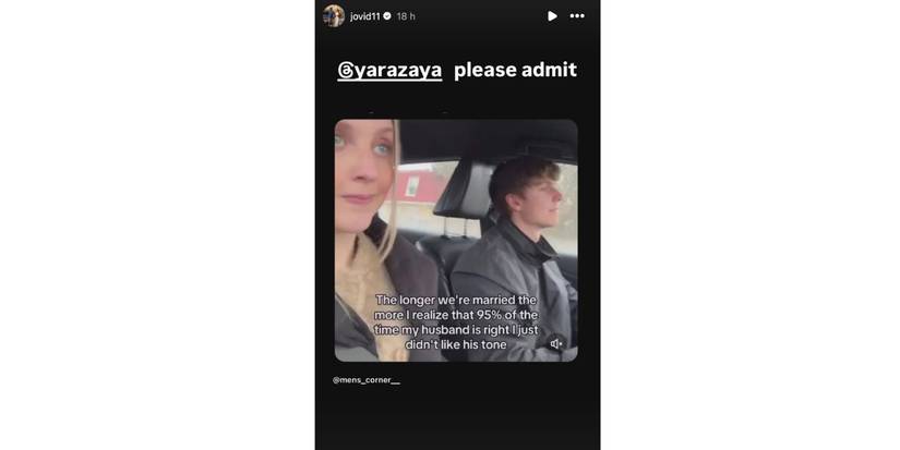Jovi compartió una publicación de @Mens_corner__ En sus historias de Instagram que mostraban una imagen de un hombre y una mujer sentada uno al lado del otro en un automóvil con las palabras “,”Cuanto más nos casamos, más me doy cuenta de que el 95% del tiempo tiene razón mi esposo. Simplemente no me gustó su tono.“Jovi agregó su propia leyenda que estaba dirigida a Yara cuando dijo:”@yarazaya por favor admite.