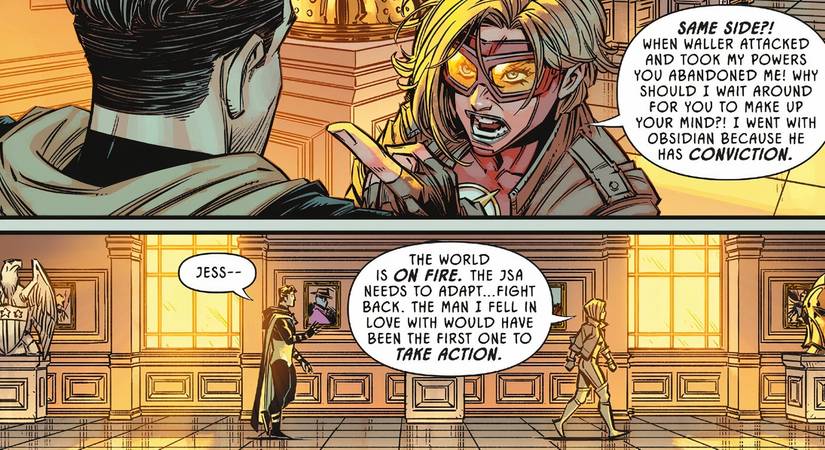 El equipo que ha estado unido desde los albores de DC Comics se desmorona aquí, y es una elección audaz pero necesaria para devolverle la vida a la Sociedad de la Justicia. Donde otras narrativas de superhéroes se desvían de lo ordinario en favor de lo extraordinario, es un testimonio de JSA El equipo creativo de #1 cree que éste encuentra lo extraordinario dentro de lo ordinario. Los ideales en conflicto no son los únicos obstáculos que enfrenta la Sociedad de la Justicia en este reinicio, ya que algunos problemas son mucho más profundos. Jade y Sandman tienen tensiones no resueltas que ella apaga para concentrarse en asuntos urgentes, y no son la única pareja romántica en desacuerdo.