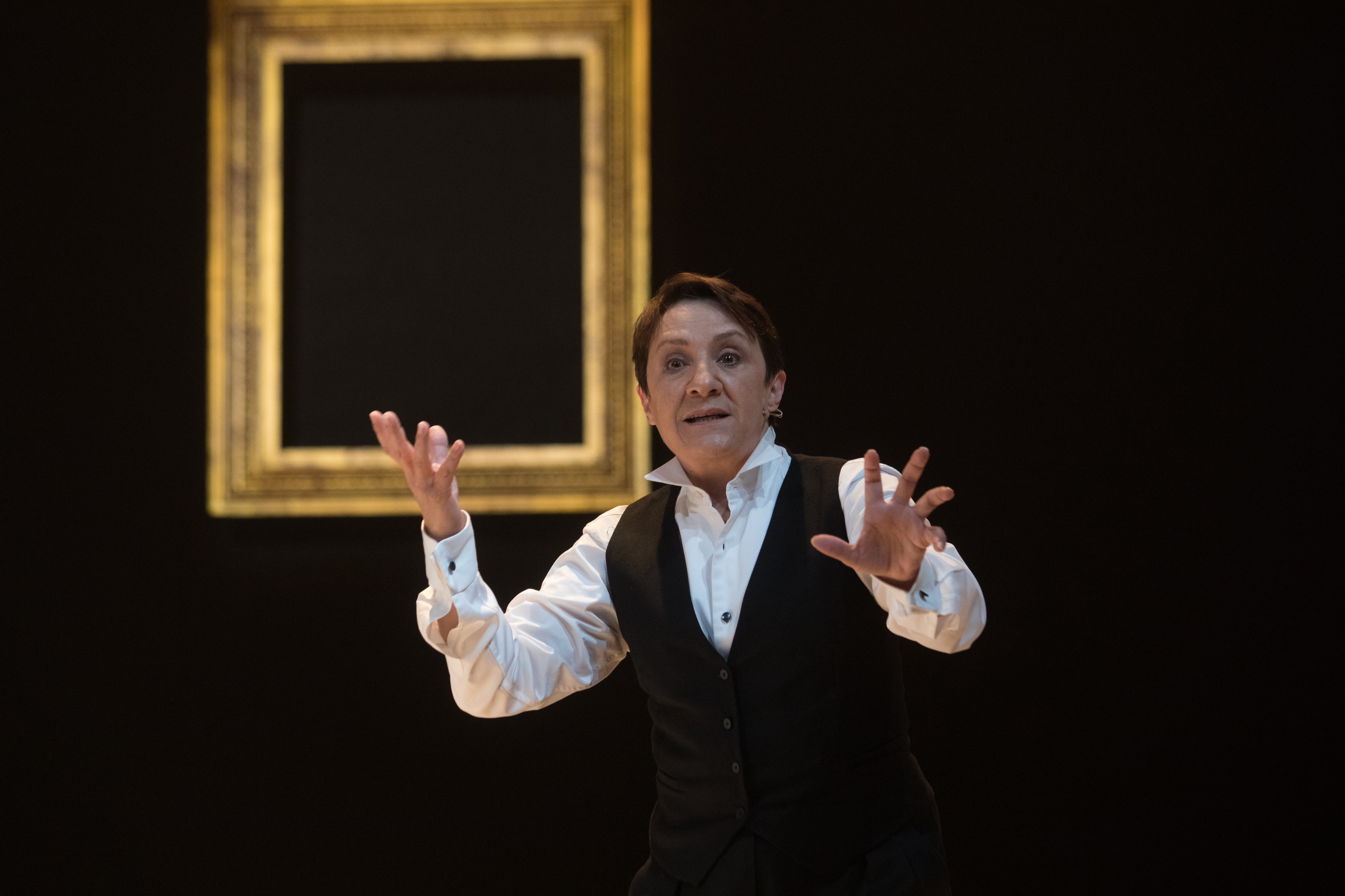 En esta segunda “escenificación”, Portillo subraya con su interpretación el juego teatral que propuso Mayorga aquel día. Desde el principio se presenta ante el público como “personaje” llevando al extremo sus gestos y sus posturas e incluso desvelándole en cierto momento cómo lo ha construido a partir de un tic en la mano derecha. Es a la vez “personaje” y “persona”; es decir, en todo instante vemos sobre el escenario de manera simultánea ―y en un mismo cuerpo― al “académico” que tiene que pronunciar un discurso y a la “actriz” que lo representa, que por otra parte no es la actriz Blanca Portillo sino una “actriz” interpretada por Blanca Portillo. Maravilla como una matrioska.