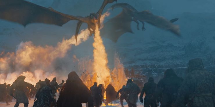 Cuando Daenerys recibió el mensaje de Gendry, decidió volar con Drogon, Viserion y Rhaegal para rescatar a Jon y su grupo de alcance. Su majestuosa entrada fue la toma más impresionante de toda la secuencia. Justo cuando parecía que Jon estaba a punto de ser asesinado por un ejército de Wights, Daenerys y Drogon aparecieron por detrás. Cuando Daenerys y sus dragones prendieron fuego a los Wights, el Rey de la Noche arrojó una lanza helada a Viserion y este se estrelló contra el lago helado.