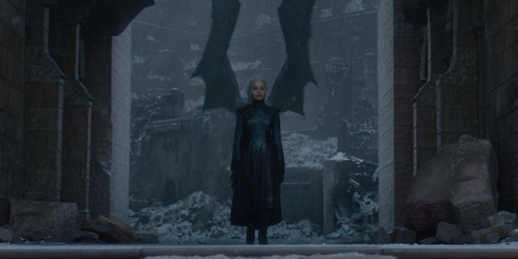 Aparece justo después de que Daenerys conquista los Siete Reinos y poco antes de que se dirija a su tripulación Dothraki y a los Inmaculados. Las puertas del castillo se abren y ella sale con Drogon extendiendo sus alas detrás de ella. Además de ser una obra maestra cinematográfica, la escena también insinúa el hecho de que no importa cuántas personas salvó en todo el mundo, la hija del Rey Loco finalmente sucumbió a su destino.