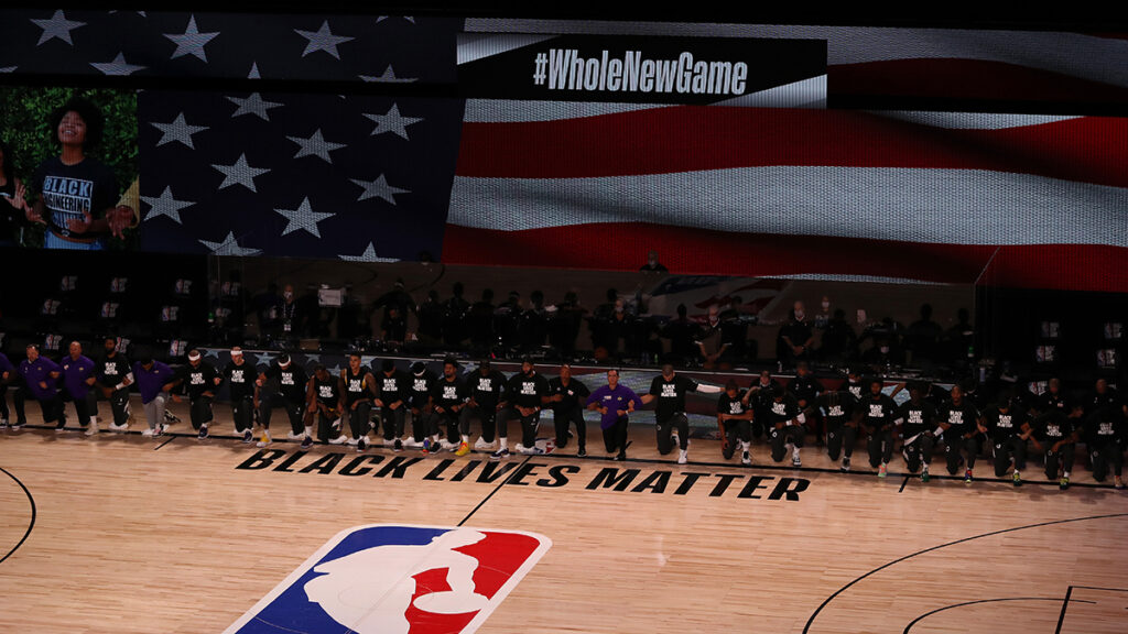 La escena, que ocurrió mientras los equipos se colocaron en la línea cerca del logotipo del movimiento “Black Lives Matter” pintado en la cancha, fue la primera de lo que se espera que sean varios mensajes silenciosos de jugadores y entrenadores que se hincarán para llamar la atención sobre varios temas. Primordialmente condenarán la brutalidad policial después de la muerte de Breonna Taylor y George Floyd en los meses recientes.