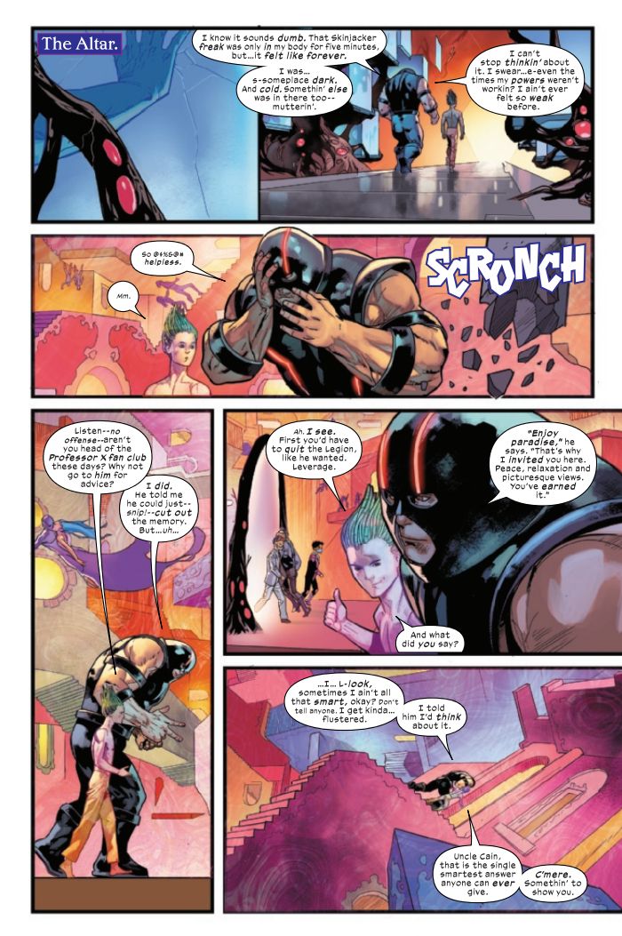 En Legión de X #3, de Si Spurrier, Jan Bazaldua y Federico Blee, Juggernaut debe lidiar con las consecuencias del encuentro. Hablando con Legion, expresa la impotencia que sintió en ese momento, describiéndose a sí mismo entre lágrimas como “roto”. Reconociendo que no es uno de los miembros más inteligentes del equipo, sin embargo, expresa su deseo de lidiar con lo que le sucedió en lugar de permitir que Charles Xavier simplemente elimine psíquicamente la experiencia de su mente. Legion, a su vez, puede proporcionar a Marko validación sobre su trauma y deseos, ofreciendo la ayuda de la conciencia de colmena de la dimensión Altar para procesar sus sentimientos.