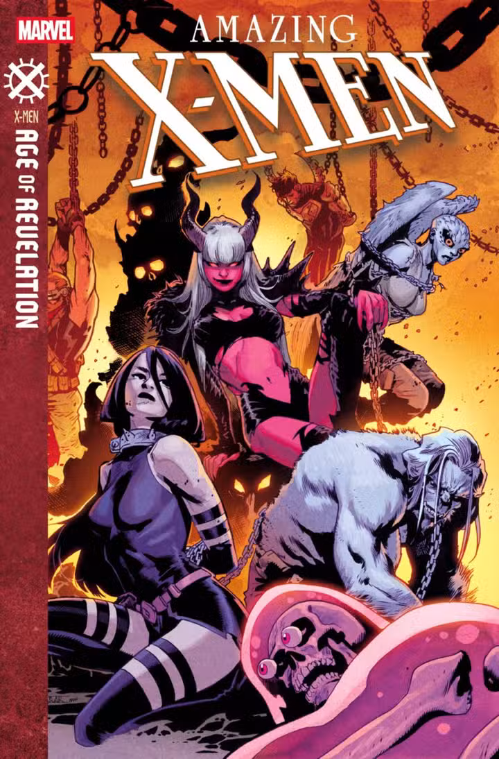 en esta semana Increíble X-Men #1 – de Jed MacKay, Mahmud Asrar, Matt Wilson y Clayton Cowles – La mente de Cyclops es arrastrada diez años hacia el futuro, donde los X-Men son ahora héroes rebeldes escondidos en la nación mutante del Apocalipsis. Intentando escapar de Wolverine, quien los está persiguiendo por las demandas del Apocalipsis, se teletransportan, solo para encontrarse en Providence, el territorio de Darkchild de Illyana Rasputina y su “caballero demonio” Gigante.