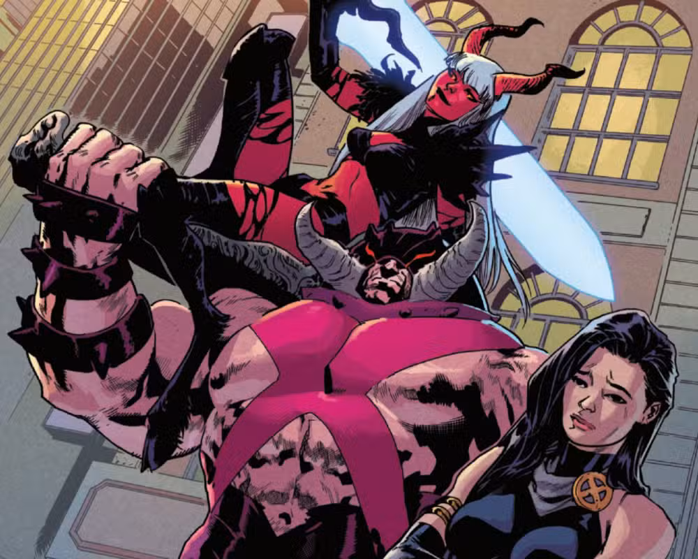 Se representa a Juggernaut sosteniendo a Illana en alto como una bestia de carga, con colmillos amenazantes y una armadura demoníaca con púas. Curiosamente, las correas que cruzan su pecho todavía forman un símbolo de “X”. Esto a pesar de que dejó el equipo hace casi diez años, después de que una misión desastrosa provocara la muerte de Illyana. Sin embargo, esa tragedia no fue el final de su historia, ya que regresó en su forma de demonio reprimido, aparentemente reclamando Providence como su territorio.