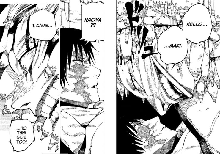 En el capítulo 191, Noritoshi Kamo y Maki ven caer del cielo un gusano gigante a una velocidad intensa. Cuando golpea el suelo, el gusano choca contra Maki con una fuerza tan fuerte que deja cráteres en el suelo, salvando a Noritoshi en el proceso. Maki está atrapada contra una pared por el espíritu maldito y no puede golpearlo debido a su increíble velocidad. Aunque Culling Game tuvo una revelación aburrida, el manga aumenta la emoción de los fanáticos cuando la cara de Naoya emerge del frente del gusano y sorprende a Maki, con una sonrisa gigante cuando dice: “¡Yo también vine a este lado!La transformación de Naoya en gusano es simbólica porque, a diferencia de Maki, creció en un ambiente rico en “tierra” o elogios y positivismo de su familia. Además, los gusanos pueden consumir su peso corporal en alimentos, imitando la enorme ambición de Naoya de ser uno de los hechiceros de jujutsu más fuertes y cómo eso alimenta su propósito, lo que resulta en su arrogancia y complejo de superioridad que caracteriza a muchos de los miembros de la familia Zenin.