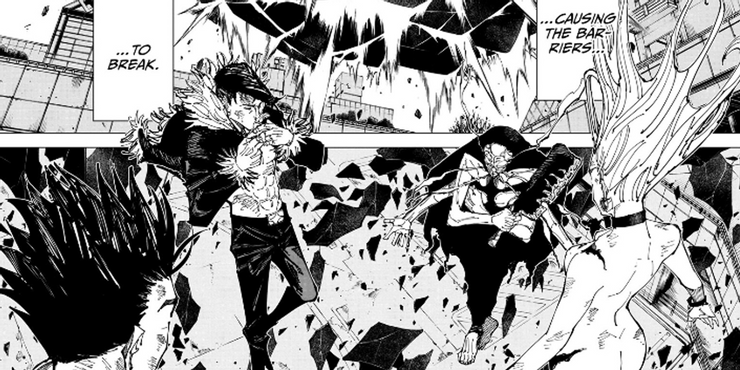 Pero entonces las tres barreras colapsan. Como explica el mangaka Gege Akutami, tener tres expansiones de dominio en lugar de dos es mucho más complejo, y aparentemente esto pone las condiciones en ambos lados de las barreras fuera de control, lo que hace que los dominios se rompan. Además, el hecho de que el espíritu maldito Kurourushi de hecho se había reproducido antes de quedar inactivo agregó un “intruso inesperado” contribuyendo a la inestabilidad general de las tres barreras. Aparte de la burla obvia por parte de Gege cuando el momento tan esperado termina tan rápido, este desarrollo inesperado crea algunas implicaciones importantes.