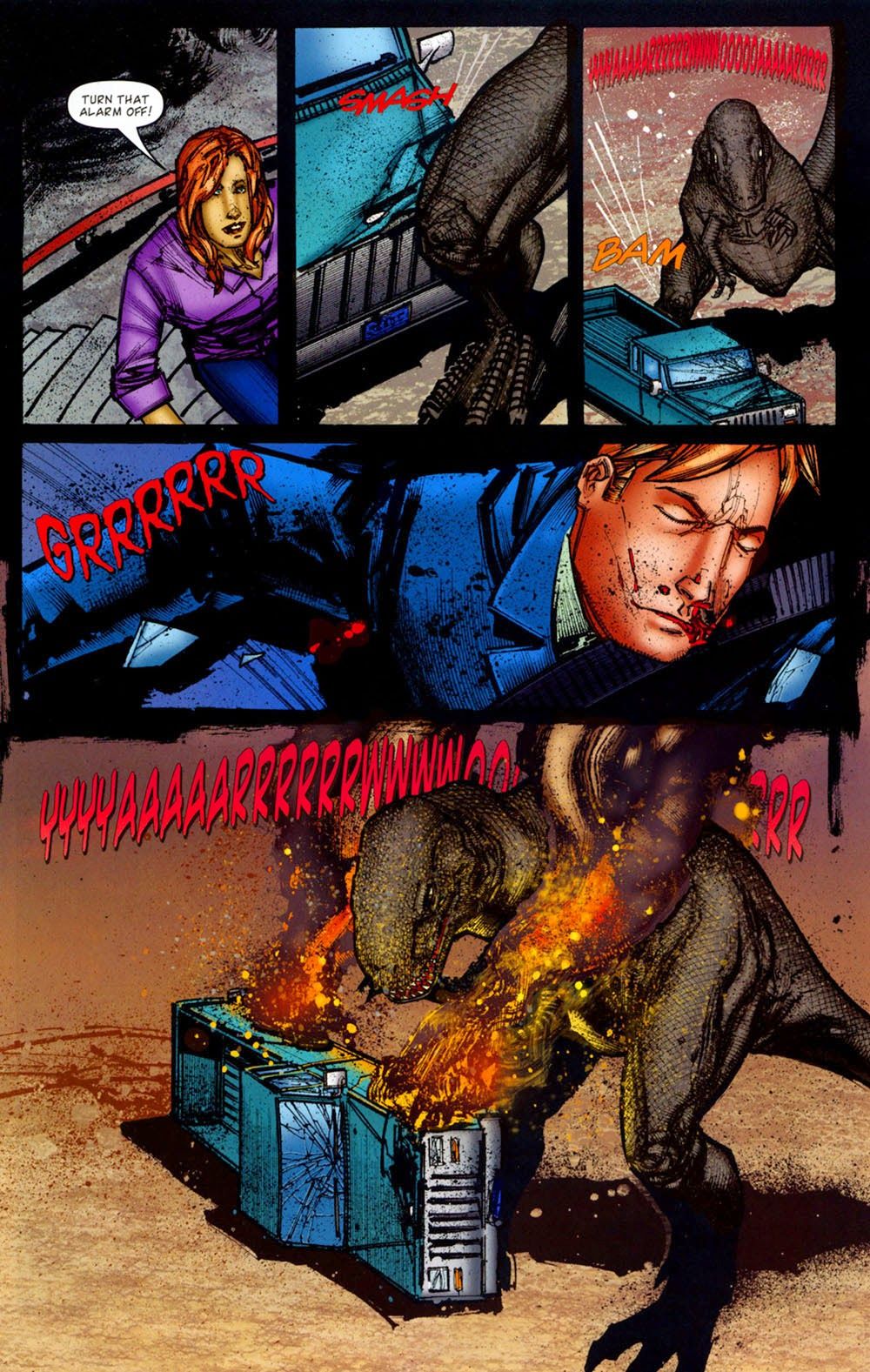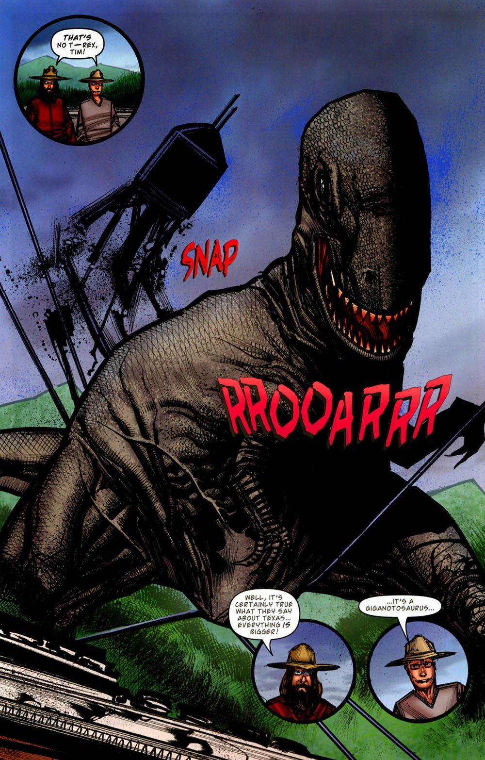 Pero antes de que ocurriera esta épica serie de eventos, el 2010 de IDW Parque jurásico mini series, de Bob Schreck y Nate Van Dyke, trajo a Giganotosaurus al redil en una historia secuela que trajo de vuelta a los alumnos de la franquicia como Lex y Tim Murphy, el Dr. Henry Wu, Ellie Sadler, Alan Grant e incluso El mundo perdido: Parque Jurásico¡El villano muerto durante mucho tiempo Peter Ludlow! Desatado en un desprevenido pueblo de Texas durante los continuos intentos de Ludlow de ser un villano completo, el Giganotosaurus actuó como el antagonista final en esta serie de cómics, solo para finalmente ser derribado por un grupo de Velociraptors en una devolución de llamada a una pelea similar que involucra a Rexy y unas rapaces al final de la primera Parque jurásico película.