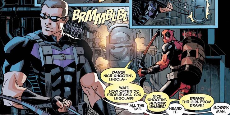 A + X El número 8 de Christopher Hastings, Reilly Brown, Brad Armstrong y Clayton Cowles de VC de Marvel Comics presentó un equipo agradable con Hawkeye y Deadpool. En el problema, Deadpool y Hawkeye se dirigen tras un grupo de piratas que intentan lanzar un submarino por ‘razones de villano’ desconocidas. Cuando Hawkeye ejecuta un gran tiro con arco y flecha, atrapando a algunos piratas detrás de una puerta que explota, Deadpool no puede evitar intentar ponerle un apodo. Recorre un lote de ellos, llamando a Clint “Legolas”, “Los juegos del hambre” y “la chica de Brave”, pero Hawkeye termina siendo inmune a los apodos y le dice al mercenario bocazas que los ha escuchado todos antes.