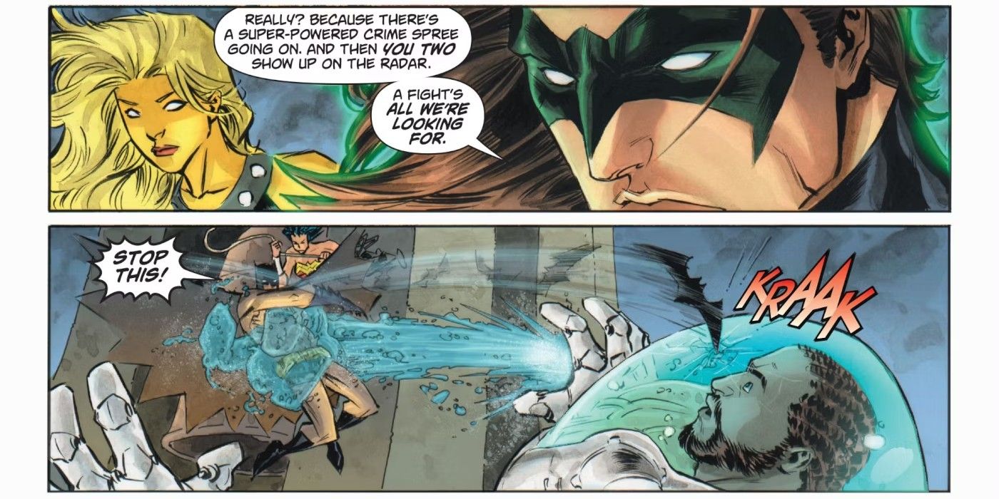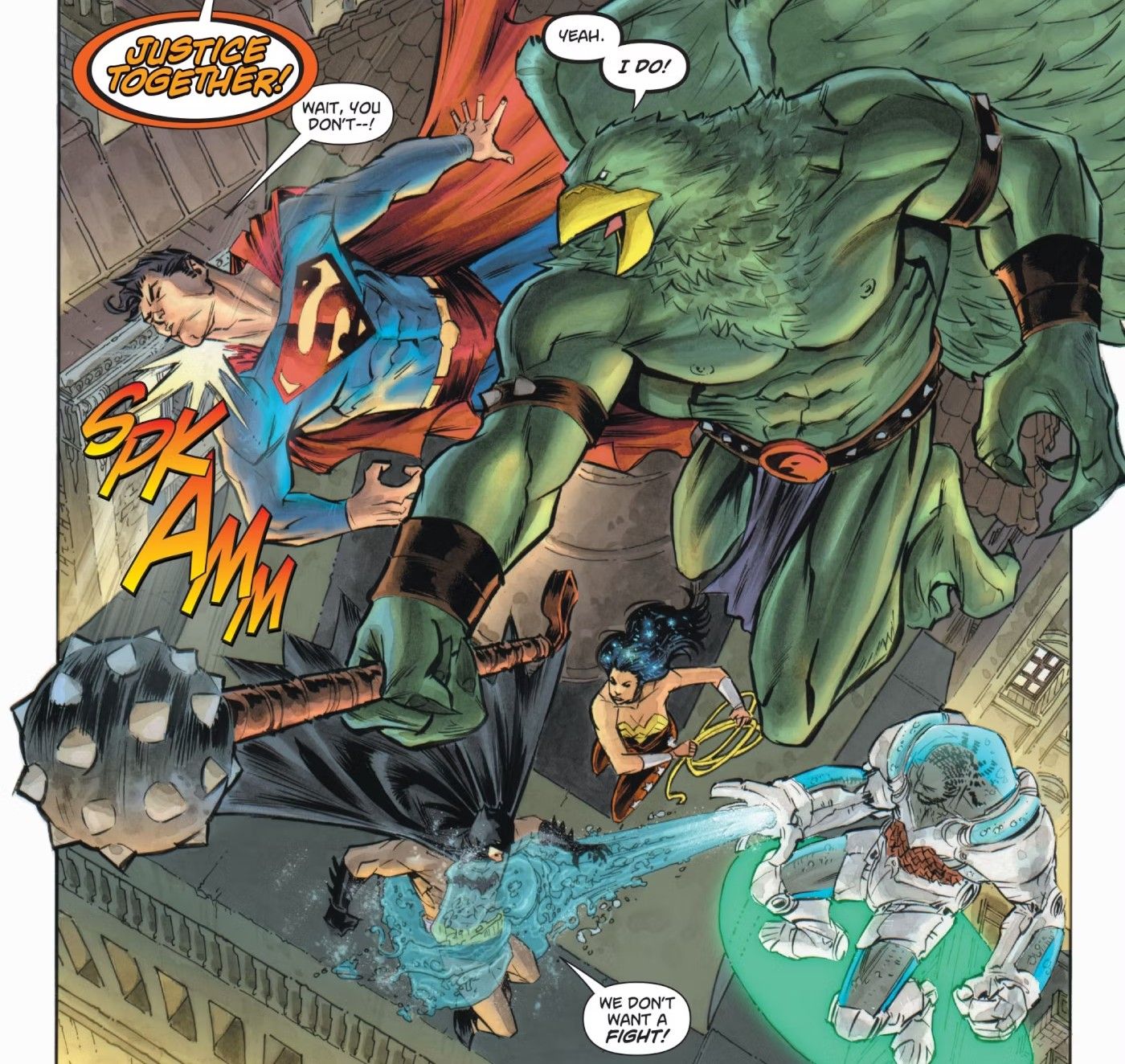 Los Justice Titans se componen de divertidas combinaciones de todos los personajes de ambas listas (excepto Flash, que es un elemento básico en ambos equipos). Batman y Superman tienen que enfrentarse a personajes como Night Lantern (Nightwing y Green Lantern), Star Canary (Starfire y Black Canary) y Aquaborg (Aquaman y Cyborg). No sólo coincide con su historia y personalidades, sino también con sus poderes. Por ejemplo, Aquaborg es un hombre con un traje cibernético que parece tener aquakinesis. Es una idea realmente divertida y otros personajes como Hawkbeast, una fusión de Chico Bestia y Hombre Halcón, tienen mucho sentido. El único personaje que no se ve afectado es Flash. Como ha estado tanto en los Titanes como en la Liga de la Justicia, se fusiona consigo mismo y se convierte en “Wally Allen”.