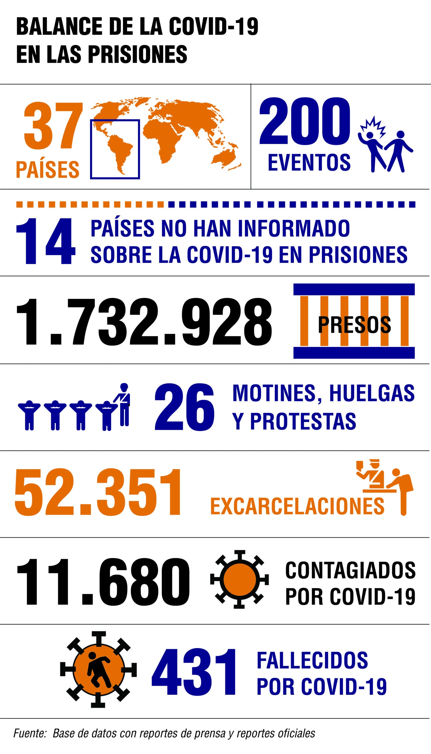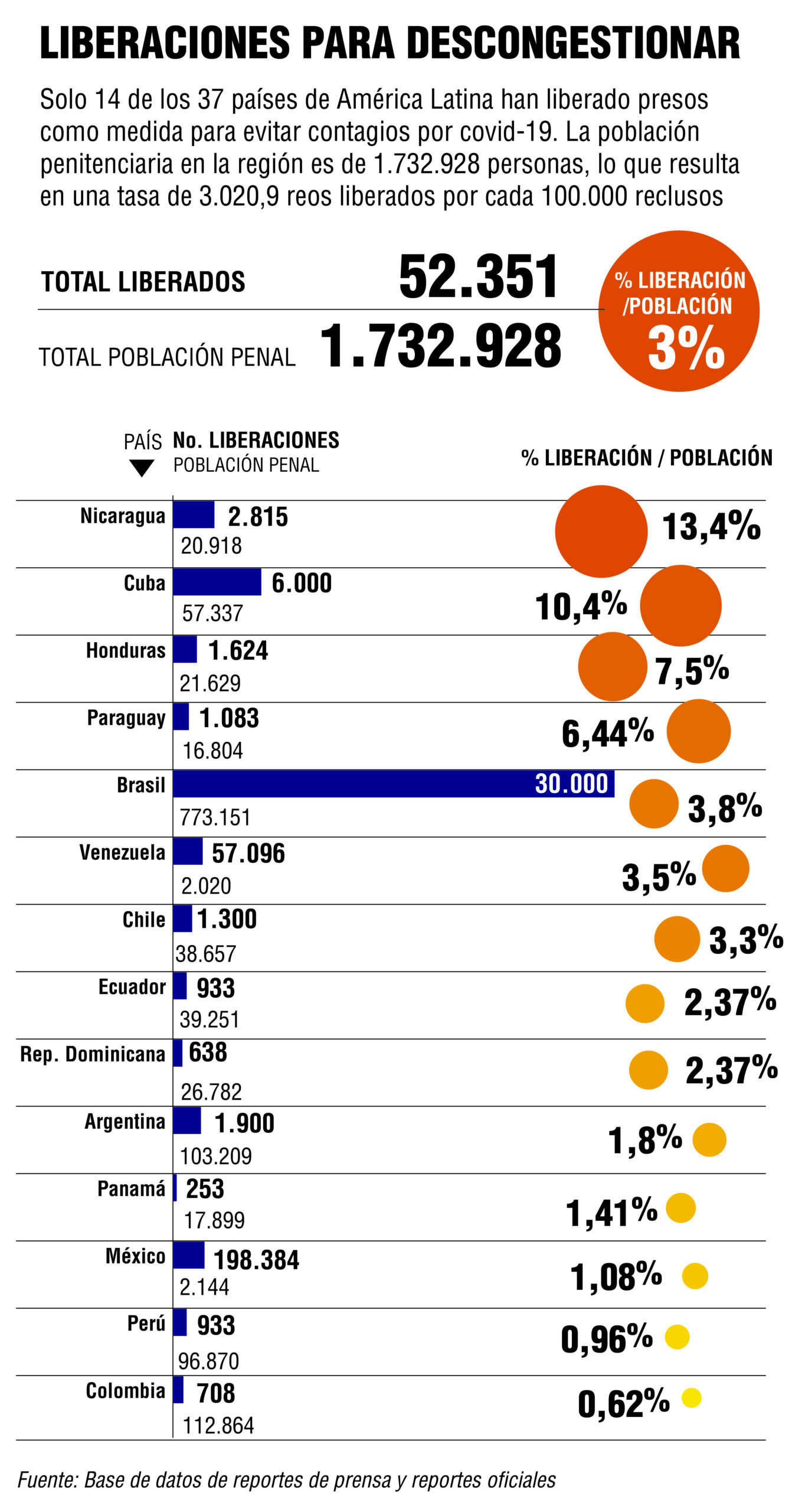 Al 15 de julio se han liberado 52.351 reos en 13 países, según el monitoreo realizado para este reportaje. Con base a las poblaciones penitenciarias de cada Estado Nicaragua excarceló a 13,4 por ciento de sus reclusos, Cuba 10,4 por ciento, Honduras 7,5 por ciento, Paraguay 6,4 por ciento, Venezuela 3,5 por ciento, Chile 3,3 por ciento, República Dominicana 2,4 por ciento, Ecuador 2,3 por ciento, Argentina 1,8 por ciento y Panamá 1,4 por ciento. Los países que no rebasaron un punto porcentual son Colombia, Perú y México, siendo este último el que menos libertades otorgó.  Brasil  quien excarceló el 3,8 por ciento, en números absolutos es el país que más presos ha liberado en la región, con más de 30.000 casos.