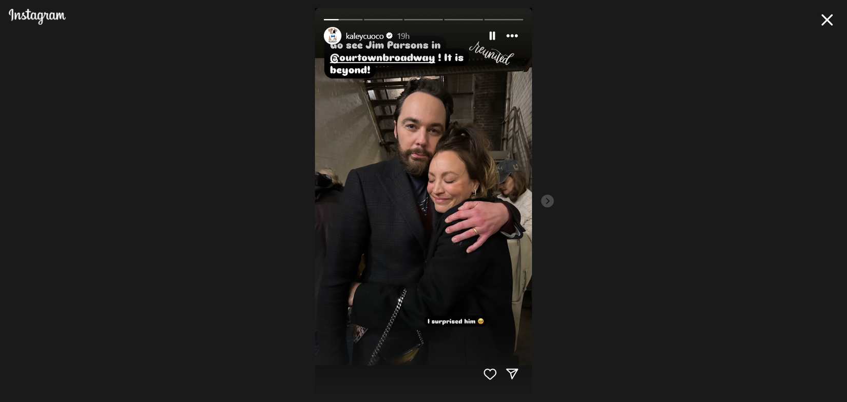 Parsons y Cuoco se reunieron recientemente en la ciudad de Nueva Yorkdonde Parsons protagoniza actualmente una producción de Broadway de Nuestro Pueblo. En una foto publicada en la historia de Instagram de Cuoco, con una captura de pantalla incluida a continuación, los ex compañeros de reparto se abrazan. Cuoco escribe que sorprendió a Parsons al verlo en la obra.