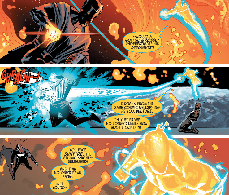 Hay muchas, muchas formas en que uno puede obtener poder en el Universo Marvel, el suero de Super-Soldado, la mutación genética y el estudio de la magia son varios de ellos. Pero pocos dan resultados tan definitivos como beber (o bañarse) sangre Celestial. De hecho, los Vengadores del 1.000.000 a. C. desencadenaron la evolución sobrehumana masiva en la Tierra de Marvel al matar a un Celestial y empapar el joven planeta con su sangre, lo que provocó una tasa excesiva de individuos con poderes. Irónicamente, este también fue un plan que Kang emprendió en las páginas de Vengadores misteriosos. Manipuló a Thor para que dañara al Verdugo Celestial para que pudiera beber su sangre y convertirse en el Conquistador del Universo. Afortunadamente, X-Man Sunfire hizo lo mismo y absorbió más poder que Kang, lo que le permitió evitar la victoria final del villano.