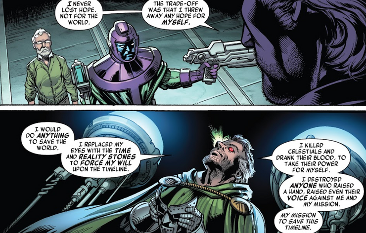 En Atemporal #1, una línea de tiempo pirata amenaza con destruir la línea de tiempo del Universo Marvel principal. Kang explica que tales líneas de tiempo generalmente se desvanecen por sí solas, pero alguien mantiene la línea de tiempo intacta. Se revela que esta es una versión malvada de Reed Richards que ha asumido la personalidad del Dr. Doom. Reed reemplazó sus ojos con Infinity Stones para ganar poder, pero incluso eso no fue suficiente para evitar que la línea de tiempo se desvaneciera. Reed también ha consumido la sangre de los Celestiales, dándole poderes divinos que le han permitido sobrevivir a todos los demás seres en su realidad.