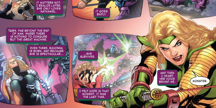 Consta de muchos elementos más pequeños que actúan como una estación de teletransportación, máquina de resurrección, asignación de roles y la estructura general que es la vida cotidiana de los Eternos, la Gran Máquina es una inteligencia artificial sensible que está inexorablemente vinculada a todo lo que hacen los Eternos, y como visto aquí, también le da a Kang un punto focal para su potencial acto final de derrota. Por lo general, solo se activa cuando reprime las amenazas que enfrenta la humanidad para sobrevivir, la idea de que Kang considera que la Máquina es el residente final de la Tierra es notable, especialmente después de que una Ravonna muy parecida a la Eterna de esta época lo desafía al igual que todas sus otras variantes lo han hecho antes. demostrando aún más que la Gran Máquina podría ser la última tarea de Kang en el gran esquema de sus malvadas maquinaciones.