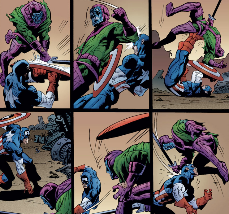 Durante la épica historia de 16 partes de la “Dinastía Kang”, Kang destruye la ONU y conquista gran parte del mundo. Por supuesto, los Vengadores contraatacan, eventualmente estrellando su nave espacial y destruyendo su ejército invasor. Los Vengadores quieren acabar con él juntos, pero Thor interviene e insiste en que ayuden a los sobrevivientes mientras el Capitán América se ocupa del propio Kang. Gracias al Suero del Súper Soldado, el Capitán América es un “humano máximo”, un término que denota a cualquier persona cuyo cuerpo está en el límite absoluto del potencial humano. Pero a pesar de este hecho, Kang se mantiene firme durante gran parte de la batalla. La pelea es entre iguales, y aunque el Capitán América triunfa, está exhausto por el esfuerzo, y parece ganar solo porque lo quiere más, mientras que Kang está secretamente contento de caer ante un enemigo digno y dejar su imperio a su hijo clon.