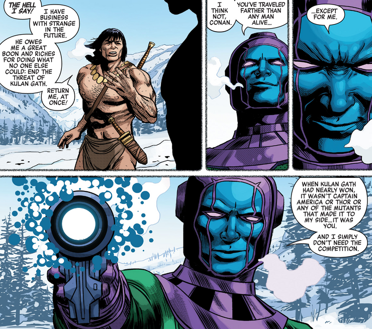 Kang the Conqueror regresa al período de tiempo en el que dejó a Conan y Kulan, aunque no llega como un amigo de Conan sino como un adversario mortal. Kang le dice a Conan que se suponía que debía matar a Kulan Gath solo para luego ser asesinado por la mano de Kang. Cuando Kang regresa después de que Conan se asegura de que Kulan no se convertirá en un hechicero asesino, inmediatamente intenta matar a Conan como pretendía hace un tiempo. El razonamiento de Kang para matar a Conan es el potencial que tiene el bárbaro para convertirse en el igual de Kang y, por lo tanto, convertirse en su mayor amenaza. Kang le dice a Conan: “En una línea de tiempo, adquieres un Casco Nova y abandonas la Tierra a fines del siglo XXI. En otro, obtienes la inmortalidad de un meteorito caído con propiedades extrañas.Básicamente, hay muchas formas en que Conan evoluciona y se convierte en una amenaza para Kang, por lo que Kang decide intentar matarlo para evitar futuros dolores de cabeza.