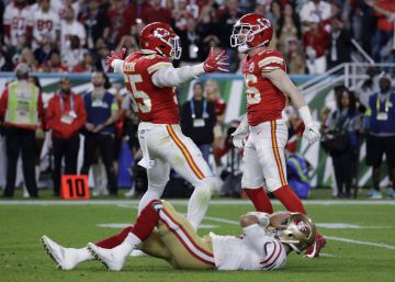 Tarvarius Moore, de San Francisco, desvía otro misil de Mahomes y evita el ataque.