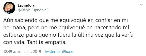 Tras borrar el primer mensaje en el que pedía ayuda, Daniel, su hermano, publicó esto tras la aparición de Karen: “Aún sabiendo que me equivoqué en confiar en mi hermana, pero no me equivoqué en hacer todo mi esfuerzo para que no fuera la última vez que la vería con vida. Tantita empatía”.