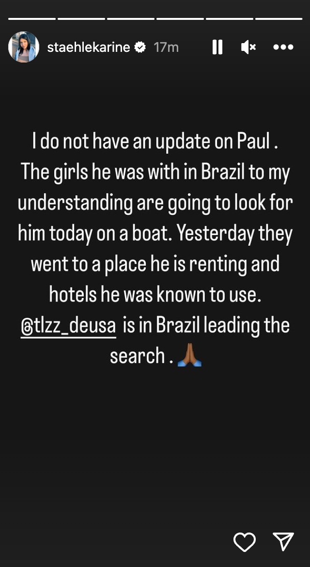 Karina informó por primera vez que no se pudo localizar a Paul el 31 de agosto de 2023. Karine pidió a los fanáticos que enviaran oraciones para que pudieran encontrar a Paul rápidamente. Desde entonces no ha habido nuevas actualizaciones sobre el paradero de Paul. Incluso en su última declaración de Instagram, Karine escribió: “No tengo ninguna actualización sobre Paul.“