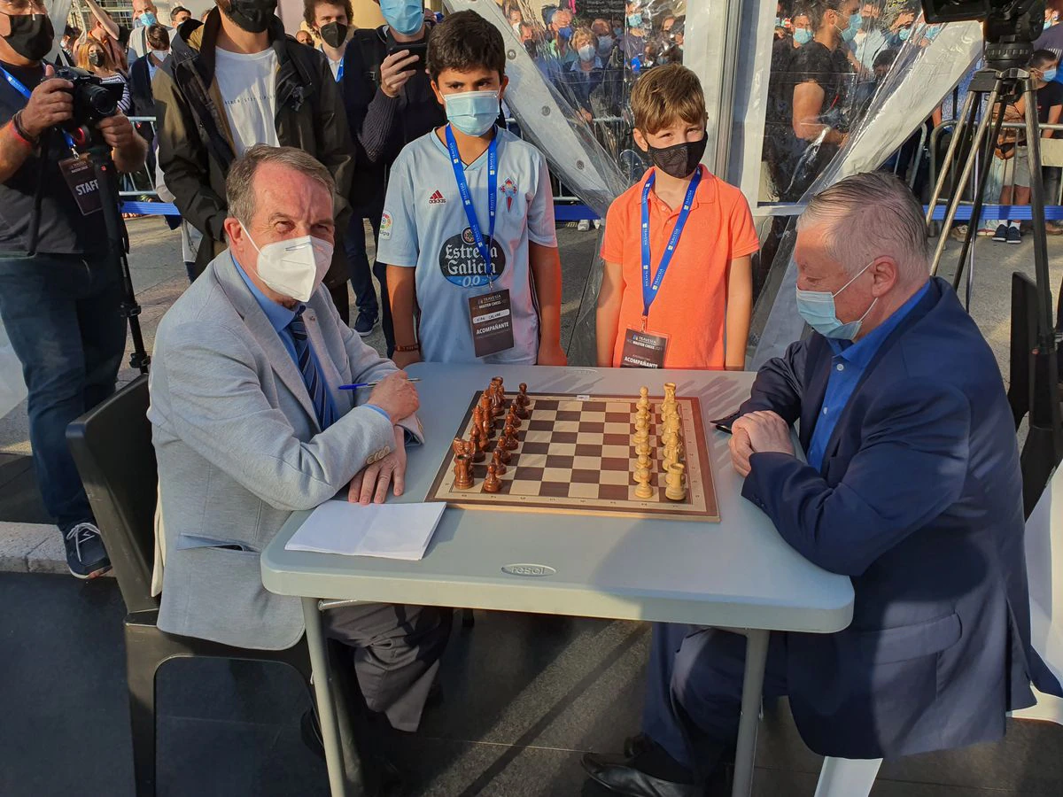 El trabajo de Kárpov siguió por la tarde con varias partidas de exhibición en la plaza adyacente al centro comercial. Primero hizo tablas en dos partidas de 15 minutos por bando frente a equipos de cinco jugadores de nivel medio-alto (los clasificados en los puestos 2 al 11 del torneo Travesía Vigo Master Chess, con más de mil participantes) que decidían en consulta. Luego otra frente al gran maestro serbio Aleksa Stríkovic, de 60 años, que ganó Kárpov. Ambos acompañados por sendos niños (Mario Montes y Xian Calvar) que realizaban los movimientos pares sin derecho a consulta. Y con una dificultad añadida, para ilustrar lo de mente sana en cuerpo sano: jugaron en un tablero megagigante de la empresa leonesa RMD, con piezas de caucho reciclado de hasta 200 kilos de peso y 1,80 metros de altura (movidas con ruedas).