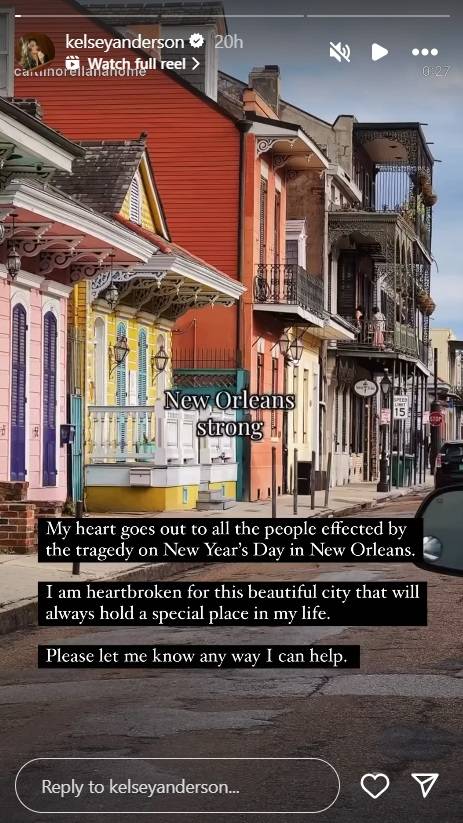 En una historia reciente de Instagram, Kelsey habló sobre lo difícil que ha sido ver noticias recientes desde Nueva Orleans después del devastador ataque terrorista de hace apenas unos días. “Mi corazón está con todas las personas afectadas por la tragedia del día de Año Nuevo en Nueva Orleans”, Kelsey compartió, junto con un video de la vibrante Nueva Orleans. “Estoy desconsolado por esta hermosa ciudad que siempre ocupará un lugar especial en mi vida”. Kelsey continuó compartiendo recursos para ayudar a los habitantes de Nueva Orleans afectados por la tragedia.con la esperanza de generar conciencia y donaciones a su ciudad.