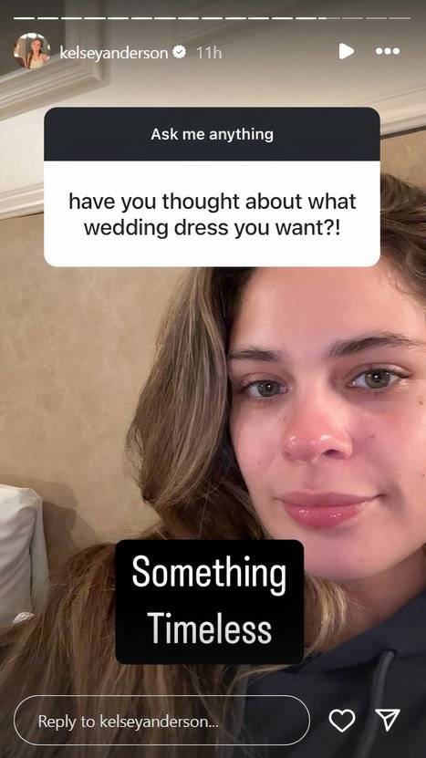 Mientras respondía las preguntas de los fans en Instagram, Kelsey proporcionó una breve actualización sobre su próxima boda con Joey. Un fan le preguntó: “¿Ya has pensado qué vestido de novia quieres?” Kelsey respondió con una selfie en la que miraba directamente a la cámara con una leve sonrisa. y agregó el texto, “algo atemporal“.