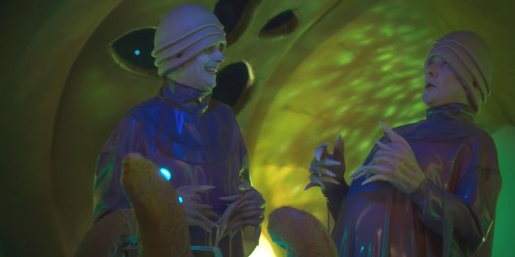 uno de los nuevos Niños en el pasillo bocetos termina con un dúo alienígena que explota la Tierra (a la Looney Tunes‘ Marvin el personaje marciano). Los alienígenas, interpretados por Kevin McDonald y Dave Foley, aparecieron previamente en la Niños en el pasillo boceto de la temporada 4 “Career Crisis”, en el que un extraterrestre le pregunta a su compañero de trabajo sobre el propósito final de su trabajo viajando por la galaxia para administrar sondas anales a campesinos sureños secuestrados al azar.