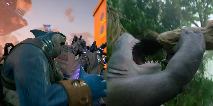 Hay un momento en Escuadrón suicida: KTJLEl tráiler del juego que muestra a King Shark destacando a un miembro solitario del ejército alienígena de Brainiac, exclamando “No hay escapatoria a mi ira”, antes de meter toda la cabeza del alienígena en su boca afilada y morder. La cámara se enfoca en las sombras tanto de King Shark como del alienígena en la pared detrás de ellos mientras ataca brutalmente al enemigo, y la secuencia termina con el Capitán Boomerang dándole un choca esos cinco por su bocadillo a mitad de combate. El momento es extremadamente familiar para aquellos que han visto El escuadrón suicida película, ya que hay varias ocasiones en las que King Shark se come a los malos enteros con un efecto brutal.