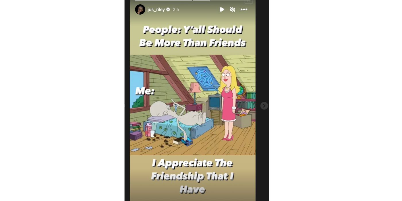 Riley También decidió abordar las especulaciones sobre su relación con Kim en su propia página de Instagram. Riley publicó un meme con padre americano personajes Francine y Roger. Riley escribió que la gente le decía: “Todos deberían ser más que amigos..” Sin embargo, Riley se sintió como un Roger indiferente en el clip. Escribió que aprecia el “amistad”que tiene. Fue Riley quien comenzó a coquetear con Kim y mostró interés en salir con ella. Riley había invitado a salir a Kim. Afirmó que su padre ya se refería a Kim como su nuera.