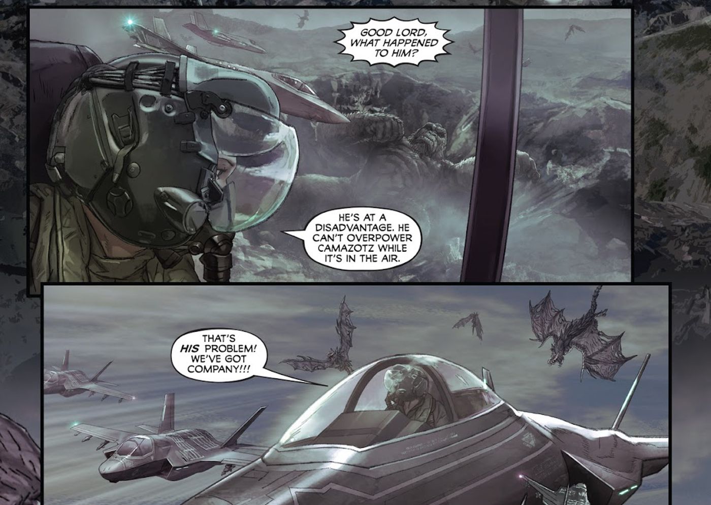 “/> Mientras Kong y Camazotz luchan por el trono de la Isla Calavera, se muestra a un grupo de pilotos de combate humanos del Equipo G de la organización Monarch librando su propia batalla para cambiar la pelea a favor de Kong. Al principio temen interferir debido a que están abrumados por los secuaces de Camazotz, pero eventualmente ayudan a su aliado y disparan contra el Titán alado. Sin Monarch, no hay forma de que King Kong gane esta batalla. Las habilidades supersónicas de Camazotz lo mantienen constantemente desorientado y su capacidad para volar hace que a Kong le resulte constantemente difícil mantener el ritmo. No habría habido un Godzilla contra Kong película sin la ayuda de Monarch, abriendo las puertas a la especulación sobre lo que sucedería si Monarch no hubiera intervenido y Kong realmente hubiera muerto.