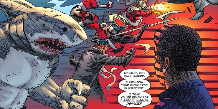 En Escuadrón Suicida del Día del Cómic gratuito: King Shark # 1 por Tim Seeley, Scott Kolins, John Kalisz y Wes Abbott, los lectores son llevados al interior de Belle Reve, donde el villano Defacer habla sobre haber sido encerrado por desfigurar una estatua de Nightwing mientras estaba en libertad condicional por vandalismo público a gran escala. Sin embargo, después de ser salvada de un ataque mortal por Hot Take por King Shark (quien se comió todo su cuerpo), Amanda Waller le pregunta al recluso sobre el incidente. Ella le pregunta a Defacer qué sabe sobre King Shark y le dice: “Sé que es mitad hombre, mitad tiburón”. Waller la corrige de inmediato, llamando al villano “tiburón completo”.