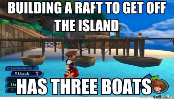 Como se ve en la imagen publicada por Vivid_Cantaloupe_219 en Reddit vía Centro de memes, a menudo se le ordena a Sora que haga cosas como construir una balsa para salir de la isla y continuar la misión, solo para encontrar un trío de botes en el otro lado de la isla completamente intactos y listos para partir. El descuido tonto ejemplifica los tipos de ocurrencias ilógicas en la franquicia.