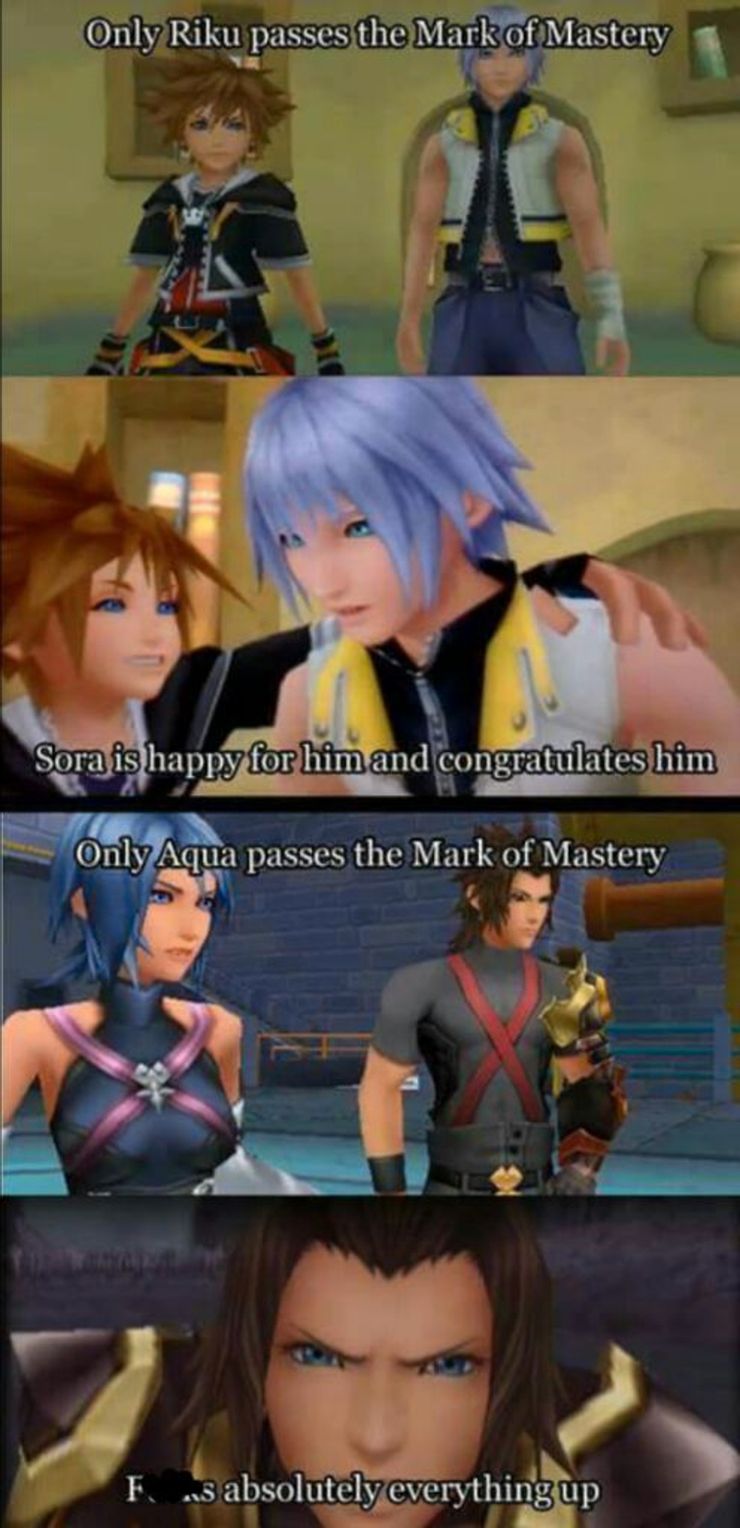 A pesar de rescatar a Aqua en KH3 e invitándola a unirse a él en la batalla contra Xenahort, Sora nunca le da a Aqua el mismo respeto o sentido de orgullo que siente por Riku, quien en realidad pasa mucho tiempo en la serie como el rival de Sora (después de ser amigos de la infancia). El meme, creado por Keyblade Master a través de aminoapps.com, enfatiza las inconsistencias de carácter que han definido a la franquicia durante décadas.