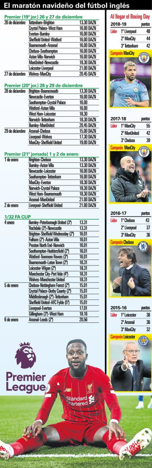 El Leicester tiene hoy un punto más, 39, que al llegarse al Boxing Day de 2015-16, la mágica temporada en que los ‘Foxes’, a las órdenes de Claudio Ranieri, conquistaron la Premier. Y, cosas del destino, aquel 26 de diciembre de 2015 el Leicester, con 38 puntos, también se enfrentó al Liverpool, que le ganó por 1-0.