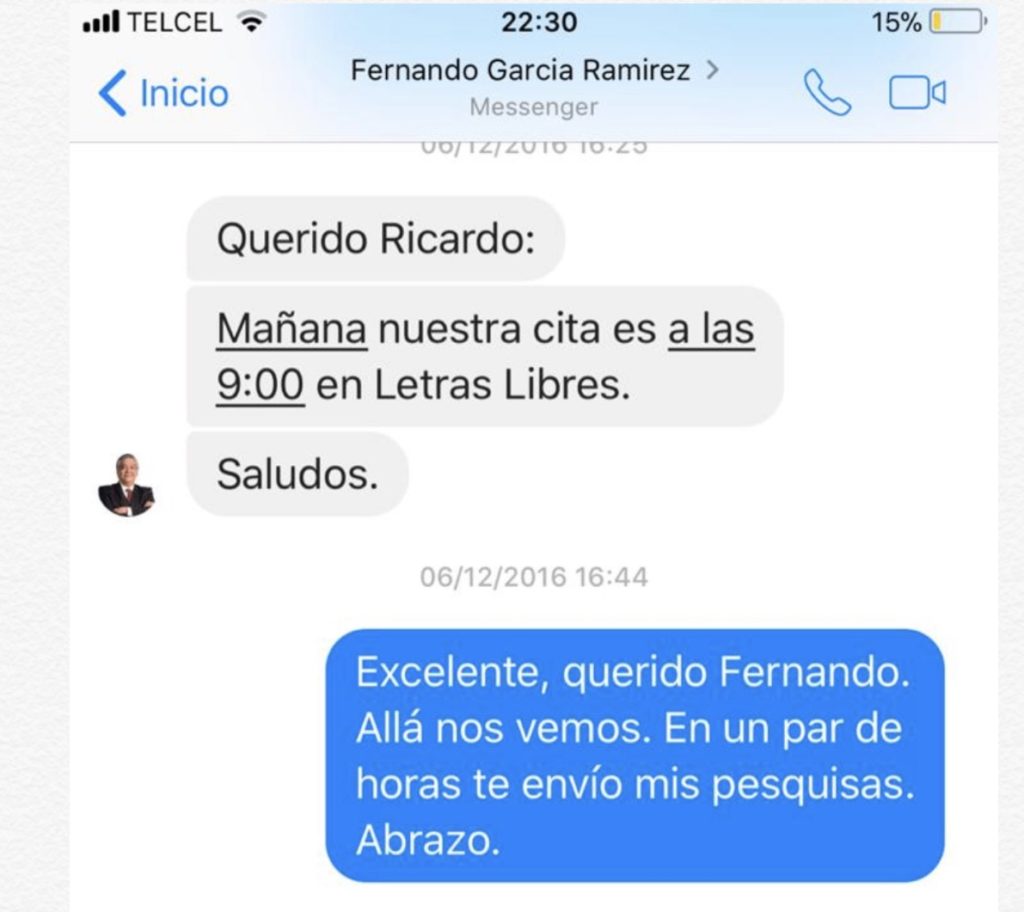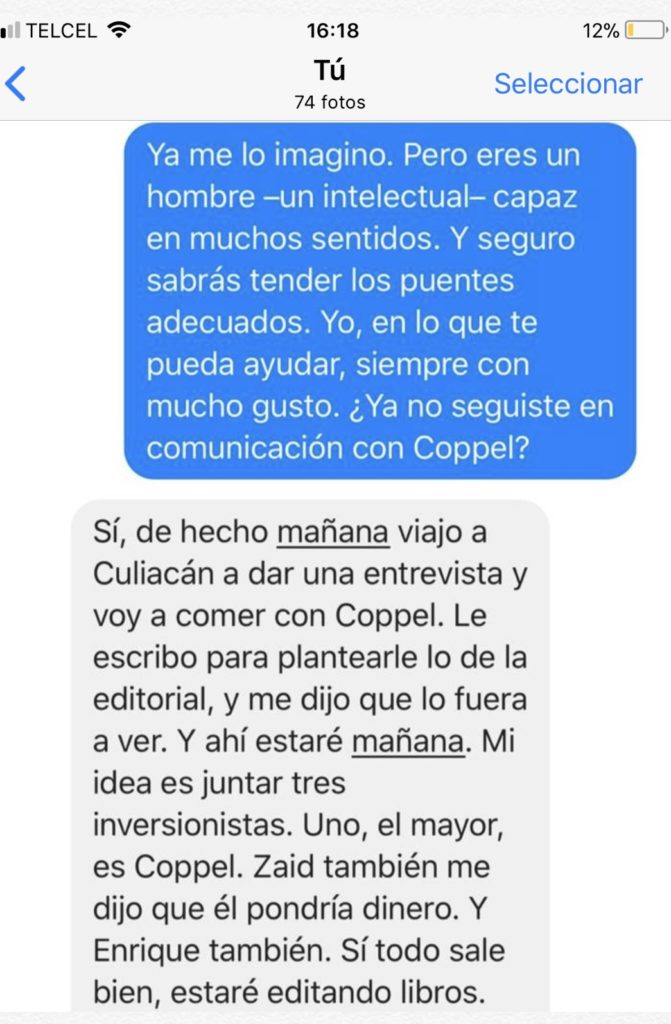 Días después, le envié un último mensaje a García Ramírez, preguntándole por mi pago de julio –el cual nunca llegaría– y sobre sus proyectos con Coppel. Me dijo, envanecido, que continuaba trabajando con ellos. A través de un mensaje en Facebook, me contó que pondría una editorial con el patrocinio de Coppel, Gabriel Zaid y Enrique Krauze.