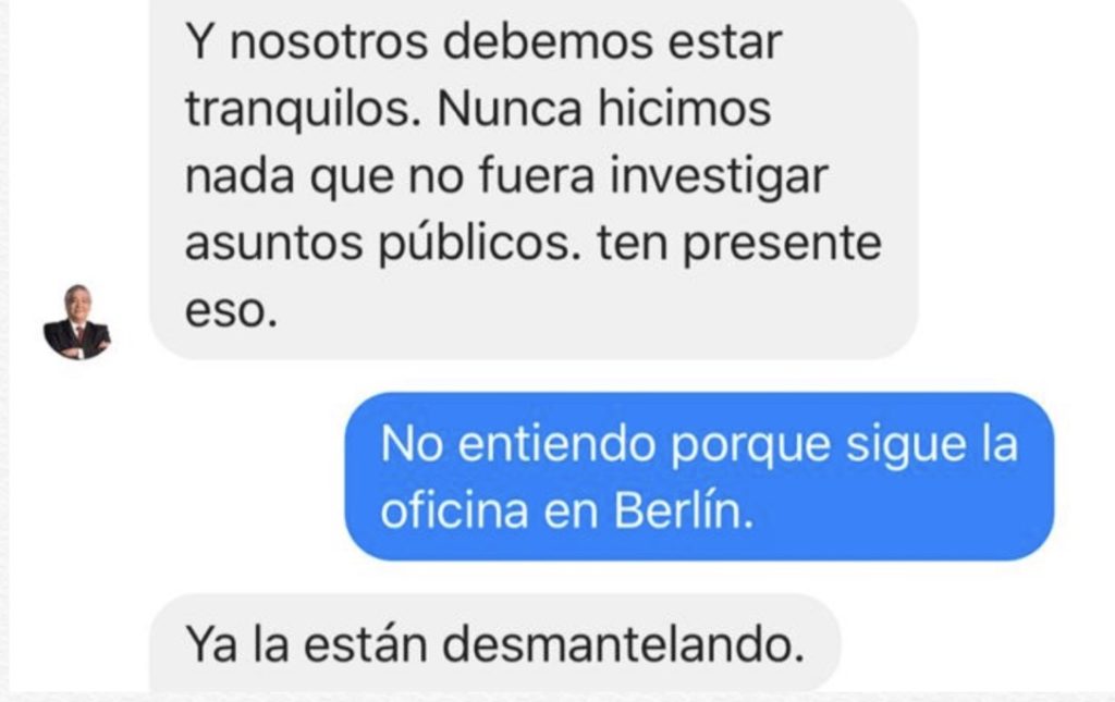 Se lo hice saber a Fernando y, por toda respuesta, intentó calmarme con un argumento ramplón: nosotros sólo habíamos investigado “asuntos públicos”. Y me pedía que me tranquilizara. Le reclamé el hecho de que la oficina de Berlín continuara operando. Hacía tiempo que consideraba que en estábamos muy expuestos en aquella casa. En una junta me dijo: “no seas paranoico, Ric”. Más tarde, en un lacónico mensaje por Facebook, me dijo: “Ya la están desmantelando”.