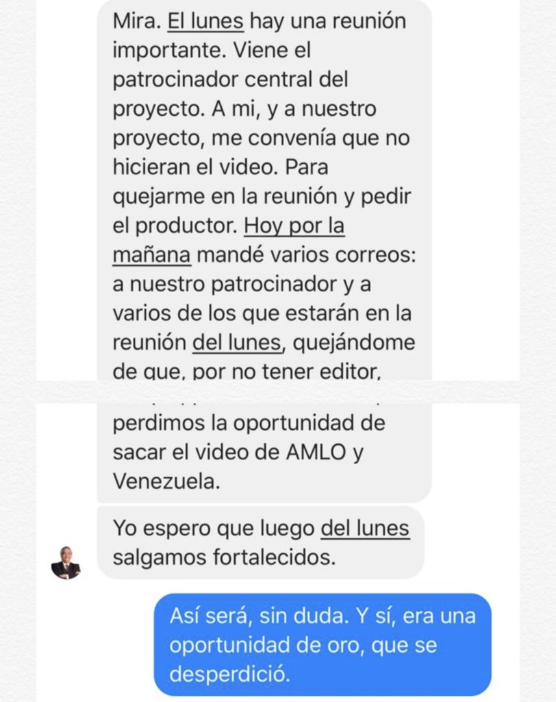 El 26 de junio, ya cuando nos acercábamos al final del alucinante proyecto, me ordenó que buscara un audio de López Obrador donde el político tabasqueño hablaba sobre “la República simulada” y el “estado de chueco”, un encargo –otro más– me dijo él mismo, con todas sus letras, de Coppel.