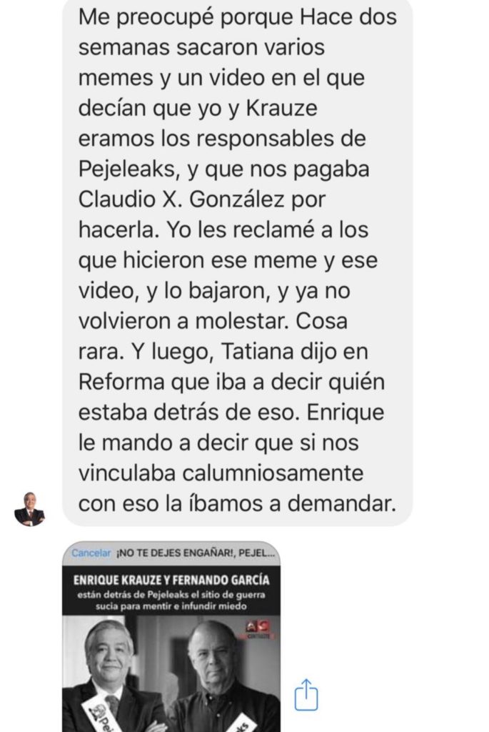 En abril de 2018, cuando la campaña de Ricardo Anaya, para quien se había hecho todo ese esfuerzo inútil, no había logrado despuntar, García Ramírez se dijo preocupado por las declaraciones de Tatiana Clouthier. Quien entonces era la coordinadora de campaña de AMLO, había indicado, en una entrevista para el periódico Reforma, que estaba por revelar quienes estaban detrás de Pejeleaks, la página contra el tabasqueño. Enrique Krauze –me escribió Fernando en un mensaje, donde se leía angustiado– había mandado a decirle a Clouthier que, si continuaba acusándolos, la demandarían por difamación. Me preocupó mucho que el columnista de El Financiero aceptara que, arrebatados por la visceralidad, habían tratado de intimidar a la política sinaloense. ¿Por qué? ¿Cómo se les había ocurrido semejante tontería? A mi juicio, al acusarla de manera tan apurada –y sin pruebas palpables de que los estuviera incriminando ella– estaban aceptando la culpa. El asunto ya había cobrado tintes delirantes.