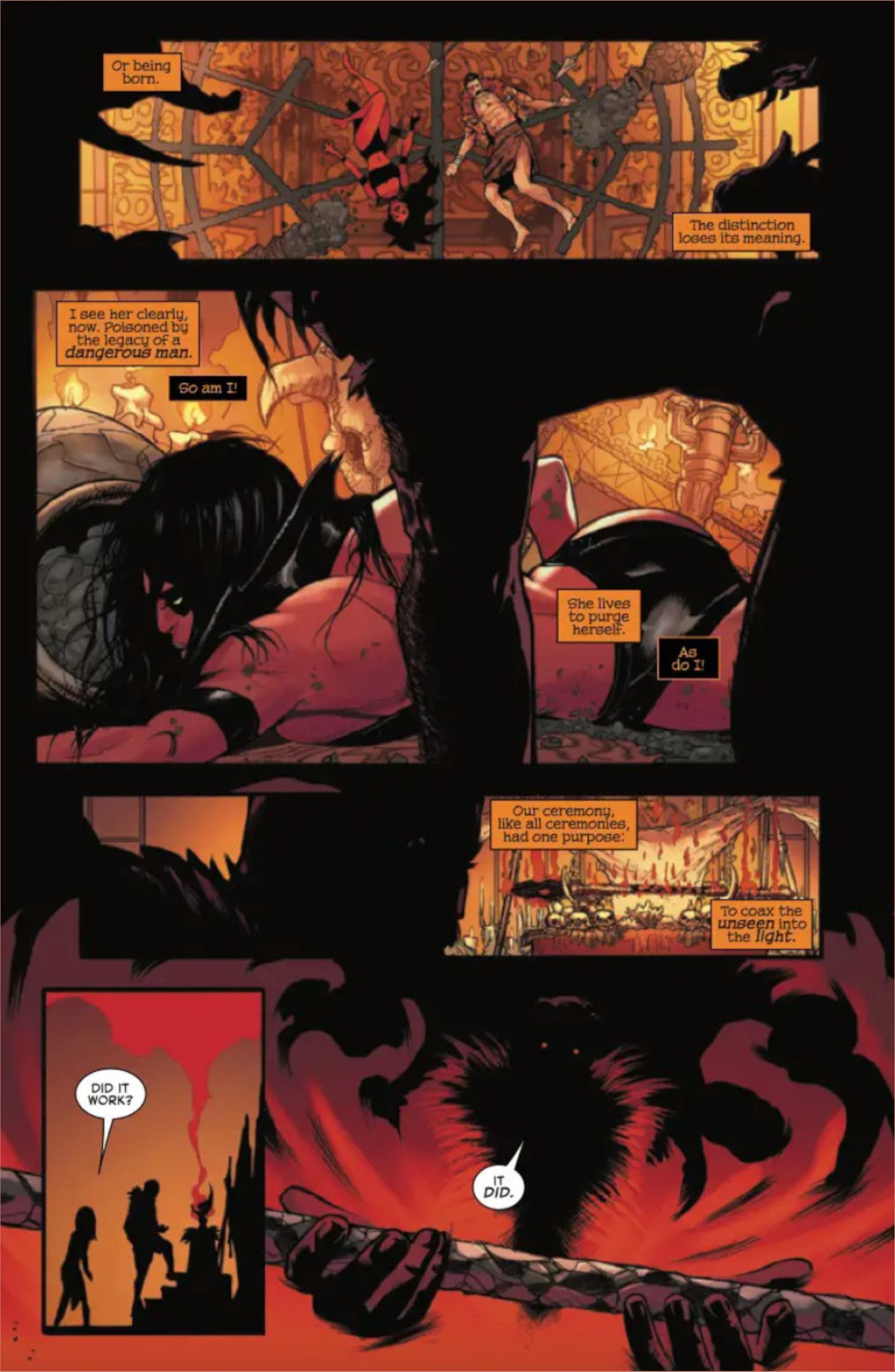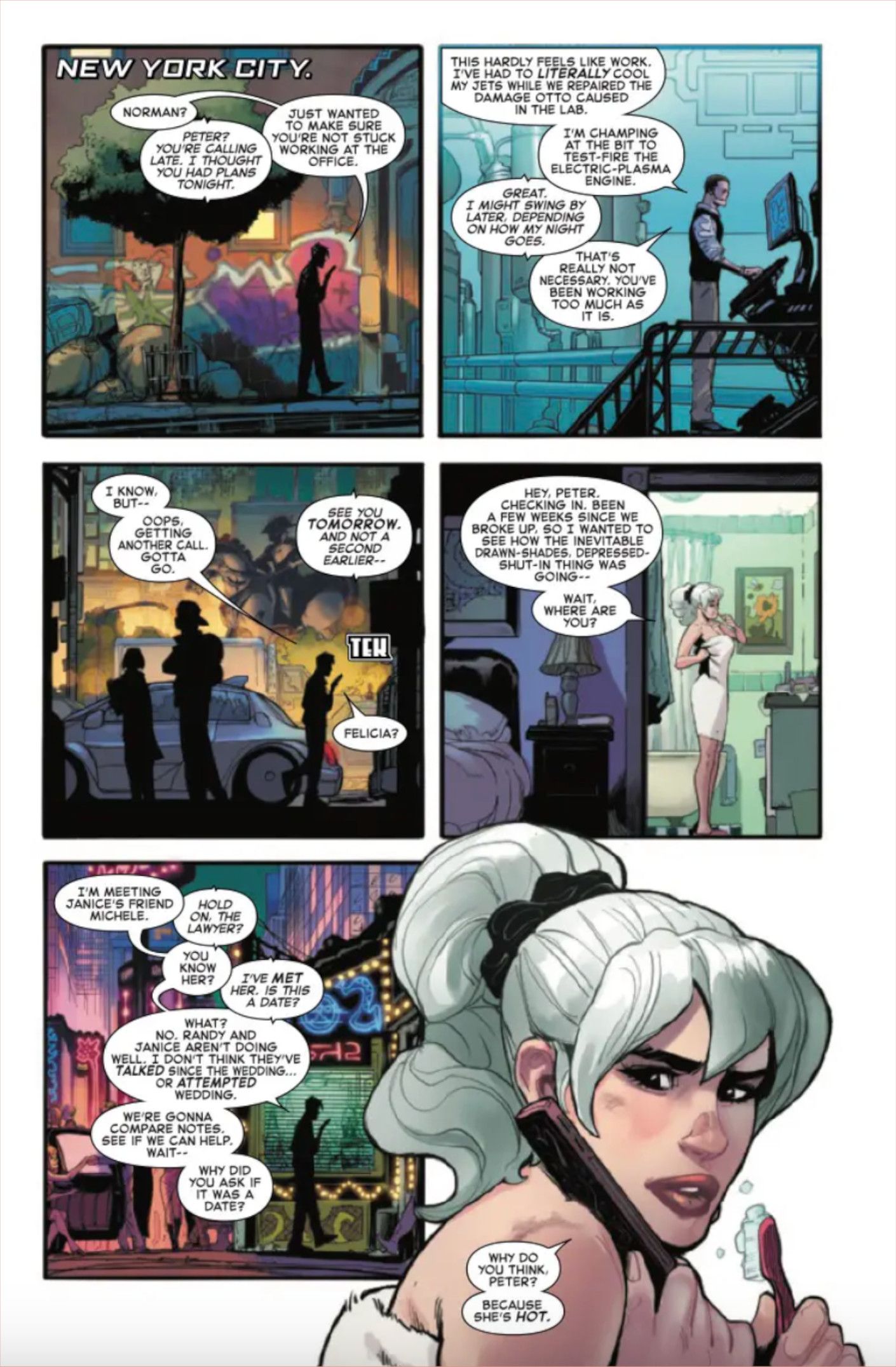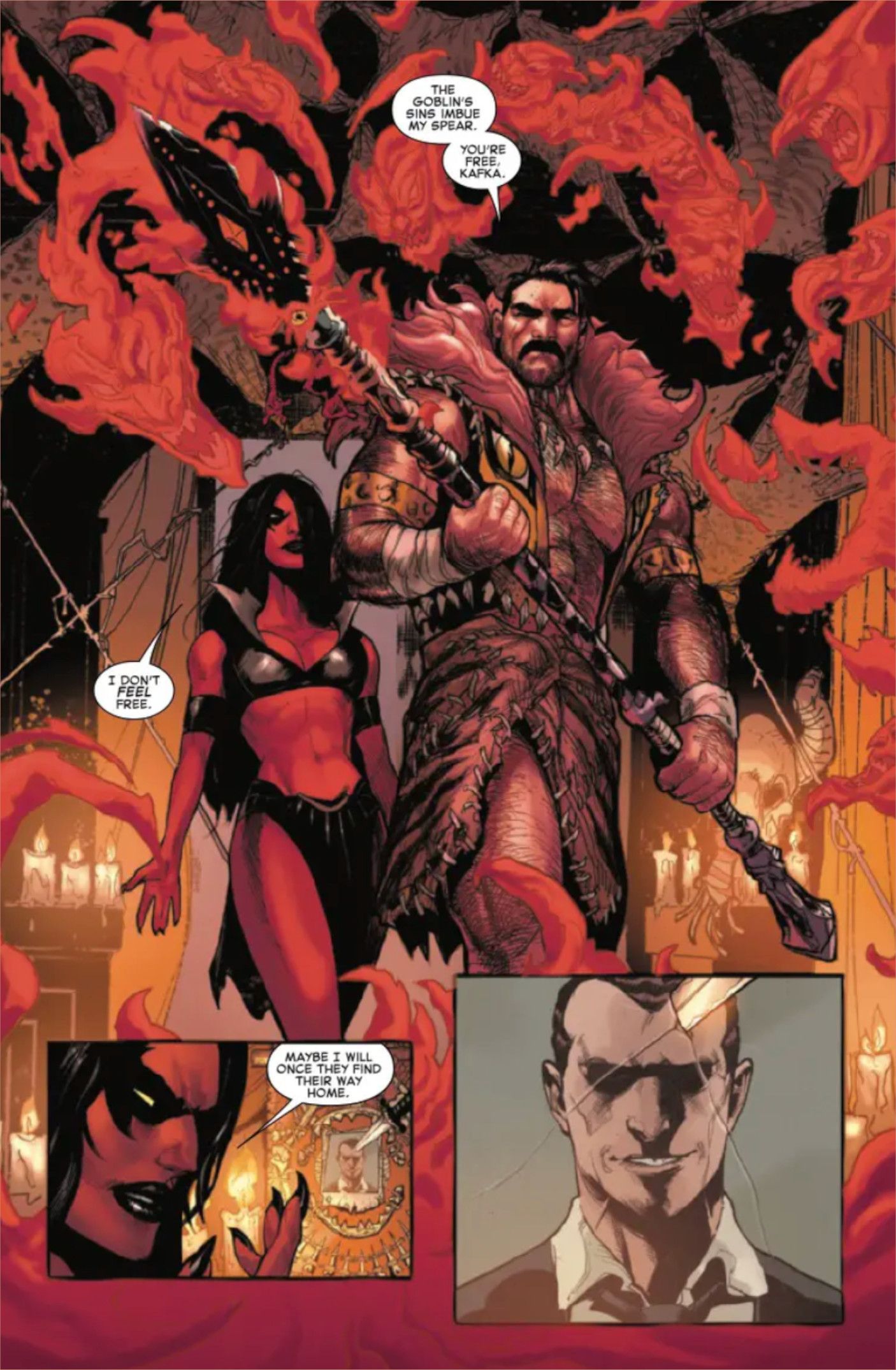 En un adelanto de El asombroso Hombre Araña #32 (por Zeb Wells, Patrick Gleason, Marcio Menyz, Erick Arciniega y Joe Caramagna), la alianza de Kraven con la Reina Duende continúa. Los dos se conocieron después de que la Reina cazara a Kraven en la historia secundaria del número anterior ‘Huntress’, que terminó con los dos iniciando un romance que amenazará con quemar el mundo entero de Peter Parker. Trabajando juntos, los dos planean vengarse de Spider-Man y Gold Goblin, el recién reformado Norman Osborn que está tratando de pasar página después de que Sin-Eater lo purgó de sus pecados. Ahora, Kraven ha canalizado esos pecados, incluido el asesinato de Gwen Stacy, en su lanza, recibiendo una mejora de poder asesino del momento más oscuro de Spider-Man.