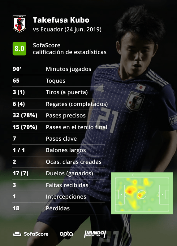 En el último partido del torneo frente a Ecuador (1-1), Kubo fue de lo más destacado. Vertical, rápido y con desparpajo, el joven nipón fue un constante dolor de cabeza para el conjunto ecuatoriano que vio como en el último minuto, el VAR le salvaba de la derrota anulando un gol al propio Kubo en el 94’.